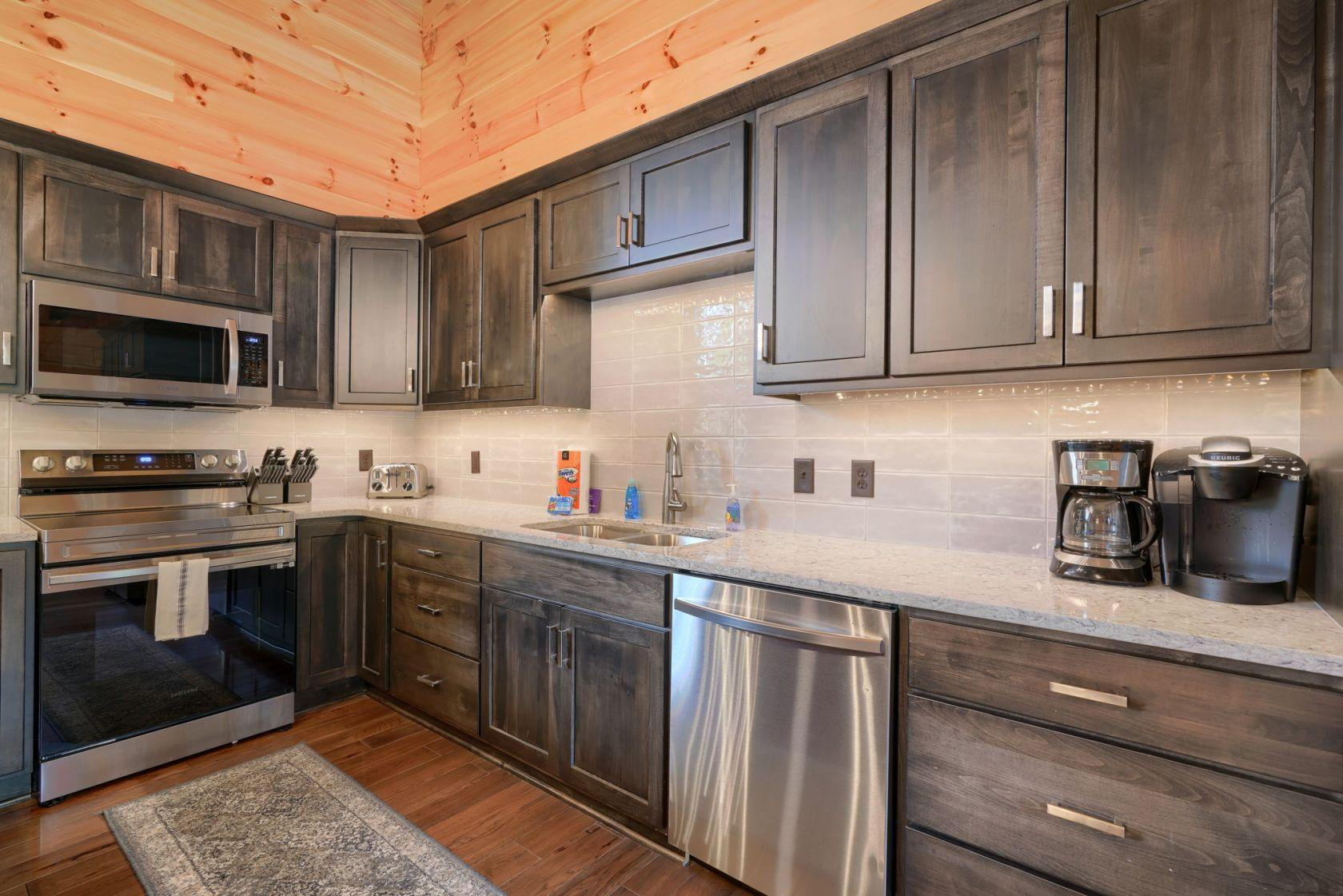 - Full kitchen with refrigerator, stove, dishwasher, microwave, 12 cup drip coffee maker, Keurig, blender, toaster, crock pot, electric griddle, dishes, pots and pans, and utensils