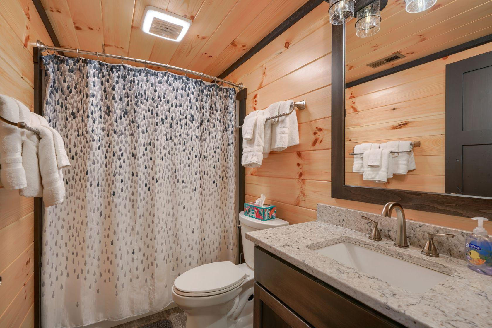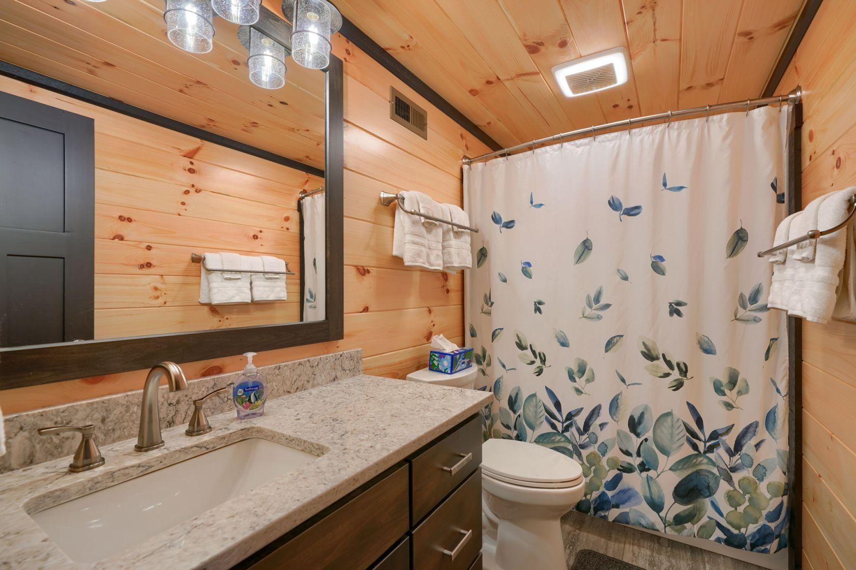 The well equipped kitchen has a table for everyone to eat together and prepare meals. There are also tables on the deck to enjoy a meal or visit with friends and family in a peaceful wooded setting. Gray Ridge features a wood burning fireplace.