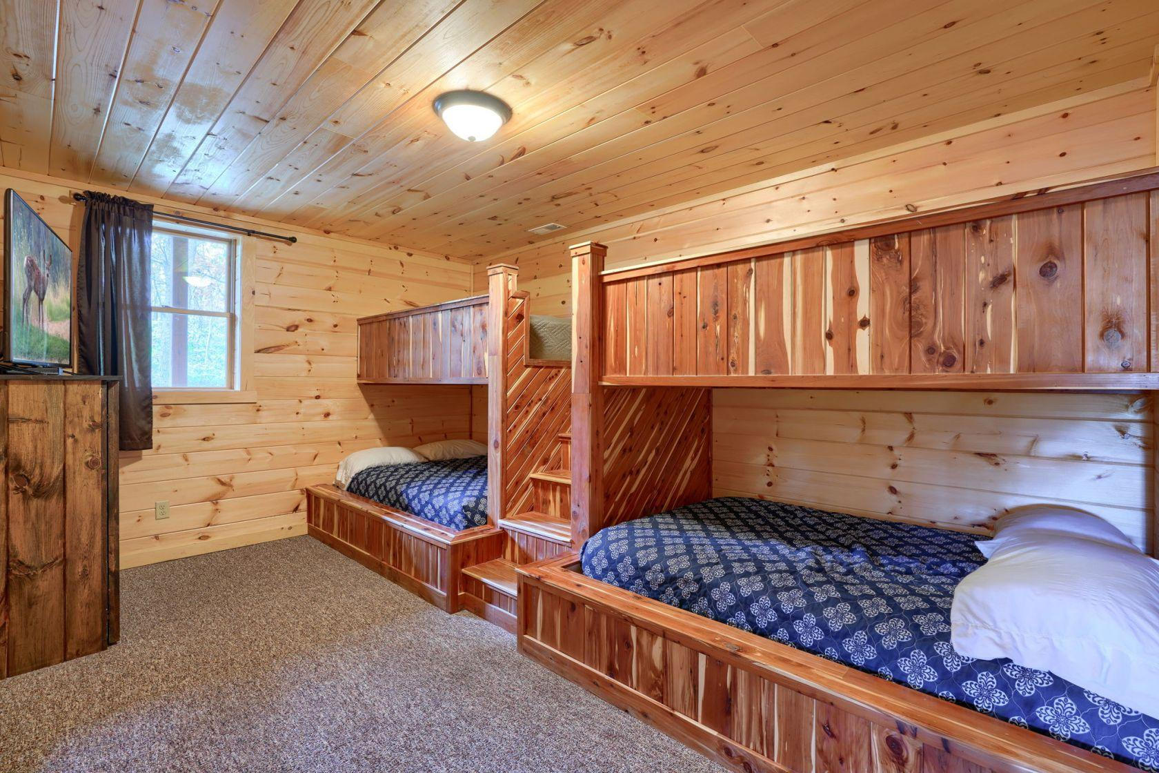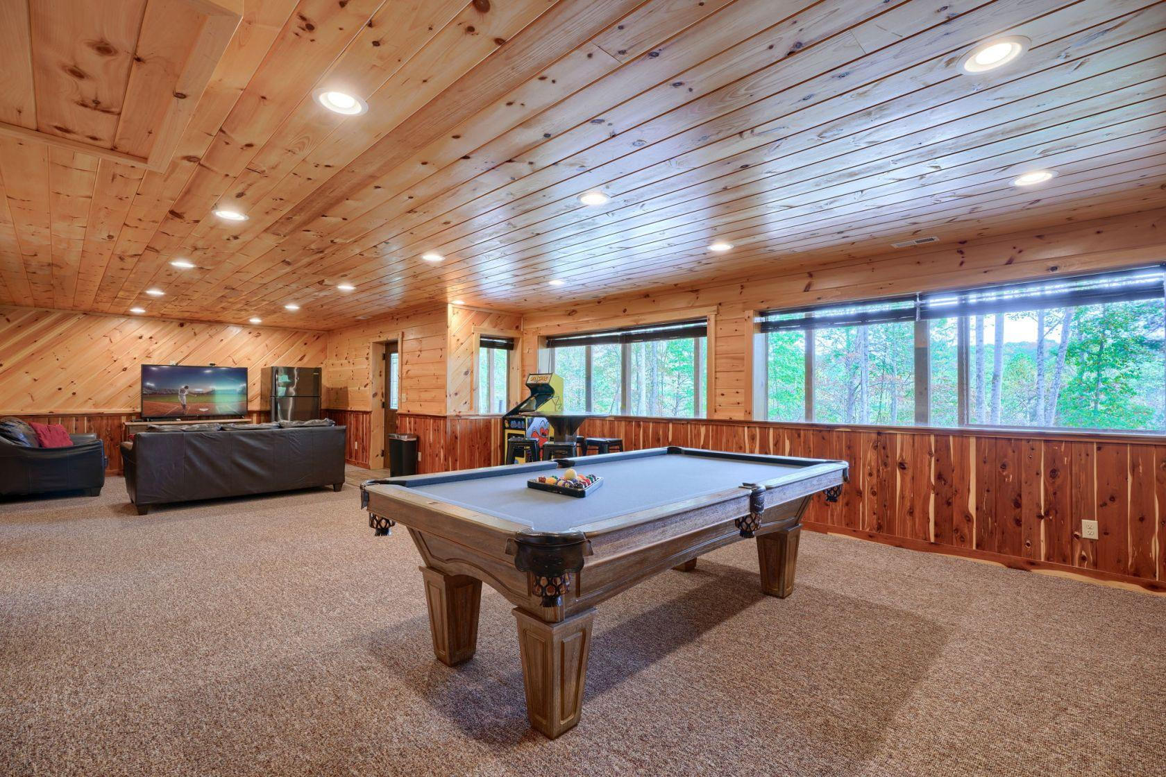 Rec room/living room with pool table, 2 full bathrooms, laundry room, 2 closed bedrooms with a queen bed, 1 bunk room with 2 full beds on the bottom and 2 twin beds on top.